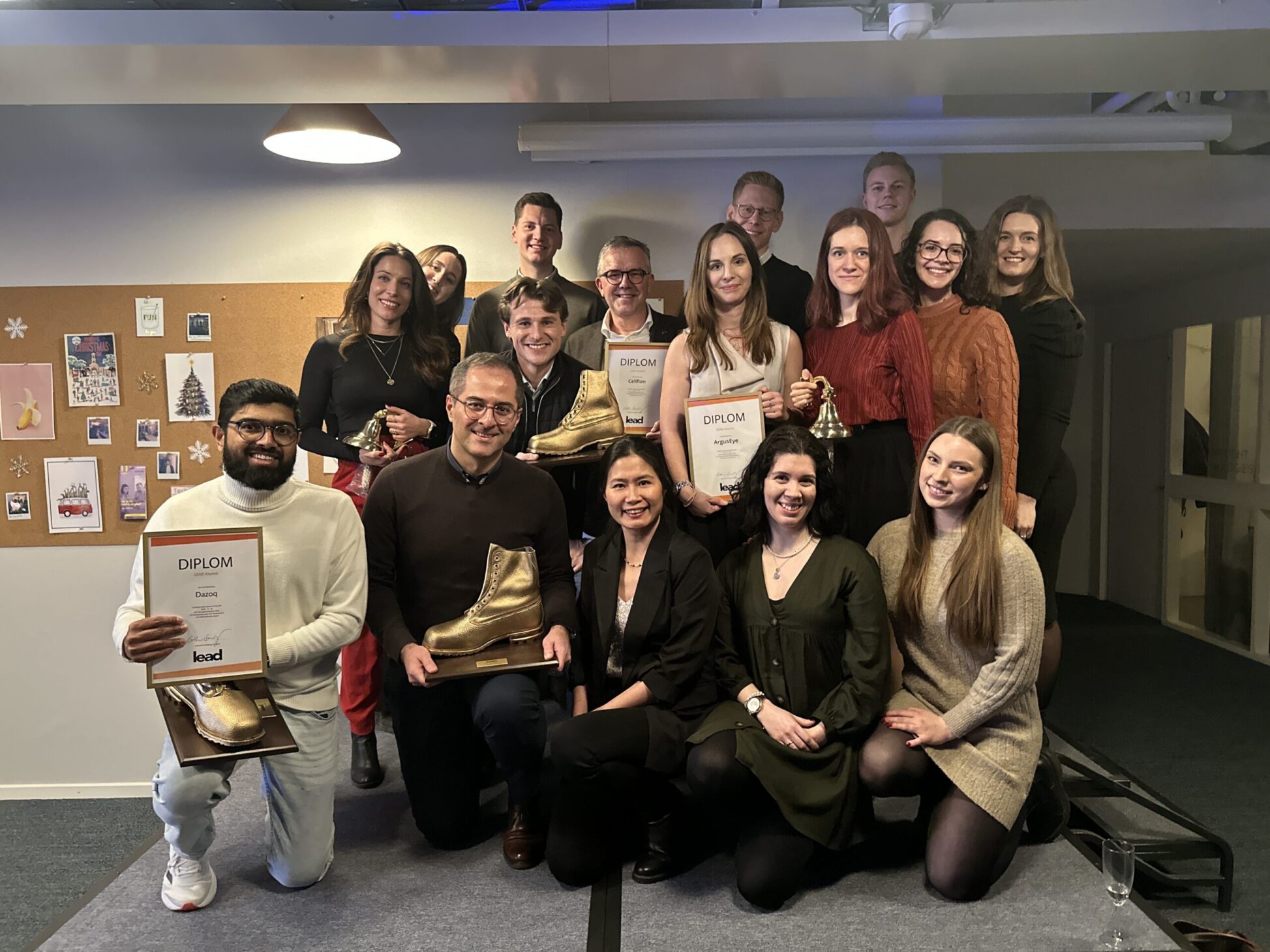 Under årets julfest på LEAD avtackades de tre bolagen med den traditionsenliga ”utsparken”. En varsin guldsko, graverad med bolagens namn, överlämnades av LEAD:s vd Catharina Sandberg. Guldskon symboliserar både det avtryck de har gjort hos inkubatorn och deras beredskap för att ta steget in i nästa fas som växande startups.